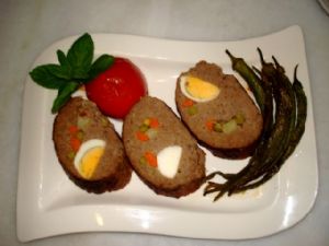 Geniş bir Bayanştırma kabına 500 gram kıymayı alalım. Üstüne 1 adet soğanı rendeleyin onun üstüne 1 tane yumurtayı kırın.Yarım demet maydanozu ince ince doğrayın ve malzemelerin üstüne maydanozu ekleyin ve köfteyi iyice yoğurun.Isıya dayanıklı fırın kabına köfteyi alıp elimizle bastırarak açıp arasına haşlanmış yumurtaları bezelye ve havucu koyup tekrar kapatalım rosto şeklinde üstüne yumurta sürüp köfteyi daha önce ısıttığımız 180 dereclik fırında pişmeye bırakalım.Fırından çıkardığımız köfteyi dilimler halinde servis tabağına alıp taze nane domates ve közlenmiş biber ile sıcak servis yapalım.