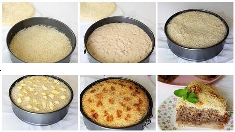 Kadayıfların yarısını kek kalıbına alalım, üzerini iyice bastıralım (bardak yardımı ile) dümdüz bir görüntüsü olmalı. Dikkatlice kalıptan çıkaralım düz zemine alalım( yağlı kağıt üzerine) Bu parçayı sonradan kekin üzerine kapatacağız , diğer kadayıfları ilk yaptığımız gibi kek kalıbına yerleştirelim. Bastırmayı unutmayın.